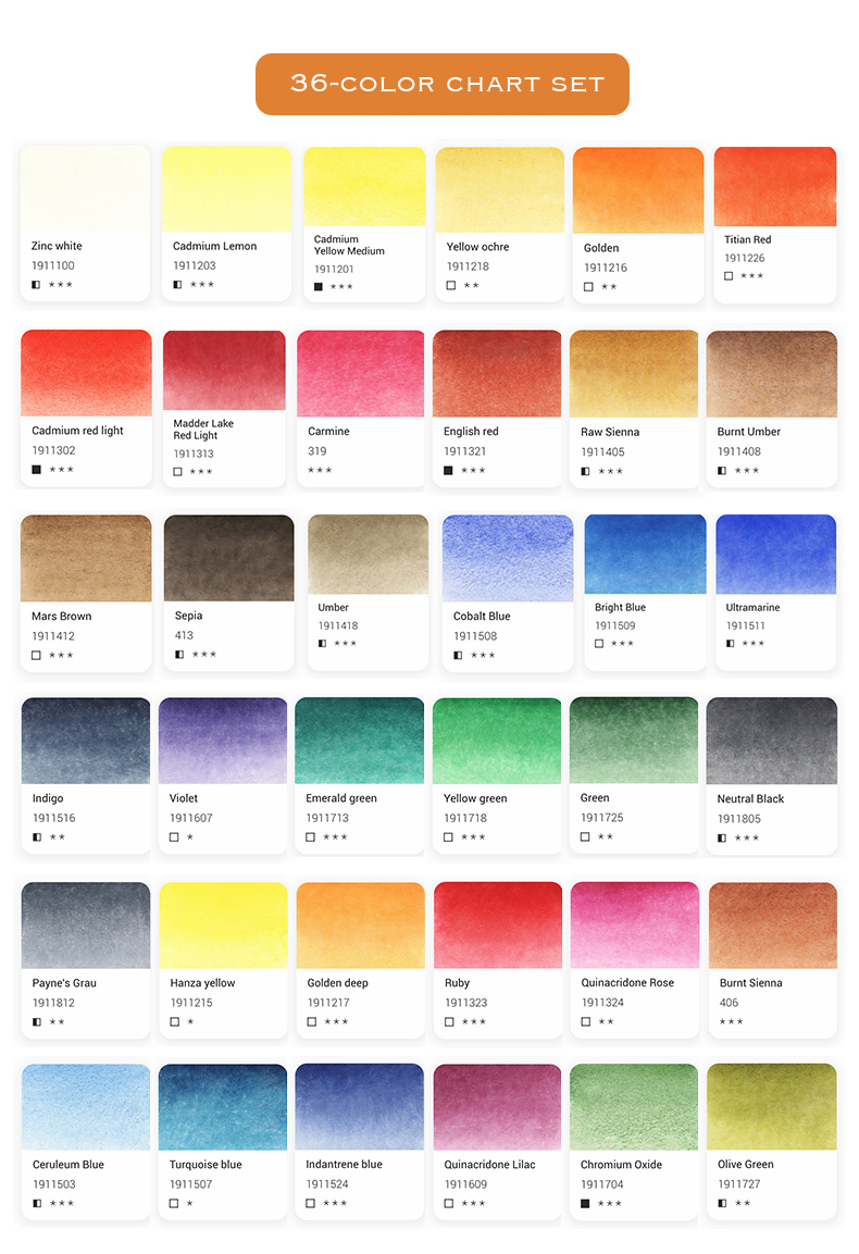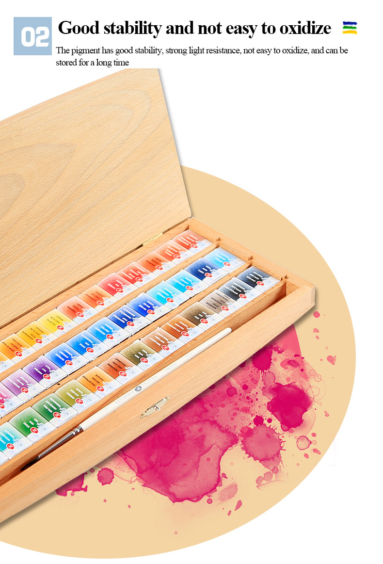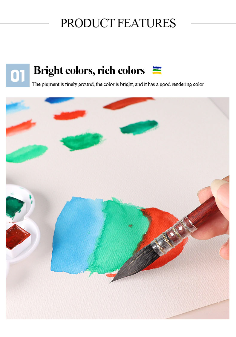 Bright colors, rich colors | The pigment is finely ground, the color is bright, and it has a good rendering color | Good stability and not easy to oxidize | The pigment has good stability, strong light resistance, not easy to oxidize, and can be stored for a long time | Concentrated solids, dipped with water for use | The raw materials are carefully made, the pigments are concentrated, and dipped with water for use, which is cost-effective and quality is guaranteed | A variety of specifications to choose | A variety of specifications and different levels are available to meet your different painting needs